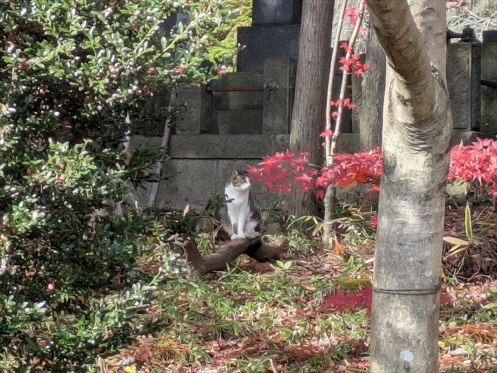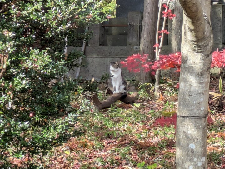 すると猫ちゃん発見。近づくと逃げそうなので遠くから8倍ズームで。紅葉のお寺の庭に猫、美しき風景。