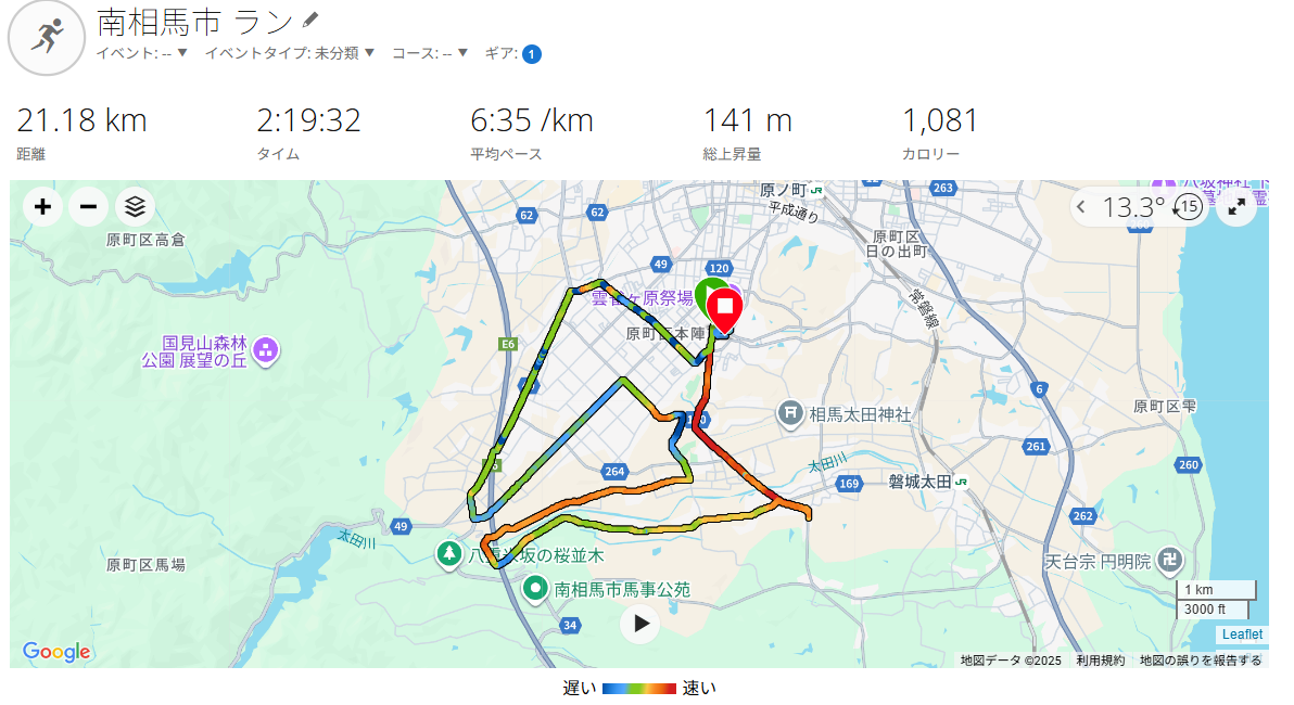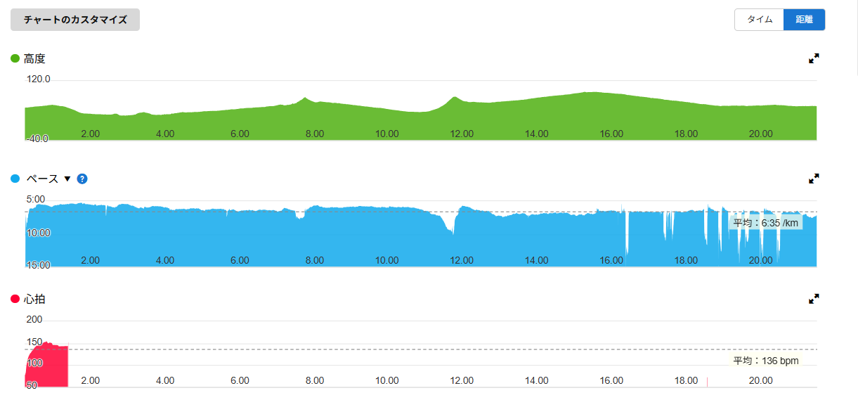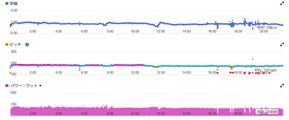 21.18km, 141m, 6:35/km, 175spm, 0.86cm, 心拍計誤作動, 174/279 watt