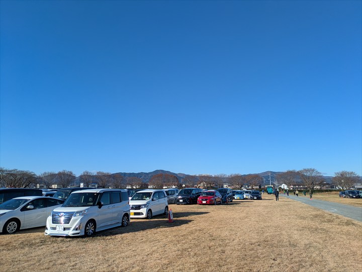 駐車場は相馬野馬追のメイン会場の、雲雀ヶ原祭事場。パンフレットに書いてあった通り渋滞覚悟ですが、待っていれば入れます。出入口が狭いのと芝生なのが影響しててそう。ちなみに終わった後出るのも渋滞です。