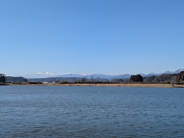 このところ空気がきれいで山がよく見える。養殖鯉の池から見る那須連山。雪がきれい。